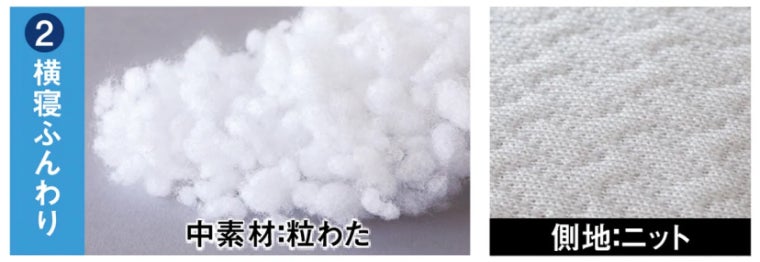 横寝は「ふんわり」サポート。サイドに使用したふんわりもっちりの粒わたは、横寝時の肌あたりと顔回りをやさしく受け止めるやわらかな感触。側地もソフトなニットで、抗菌防臭加工を施した清潔仕様です。
