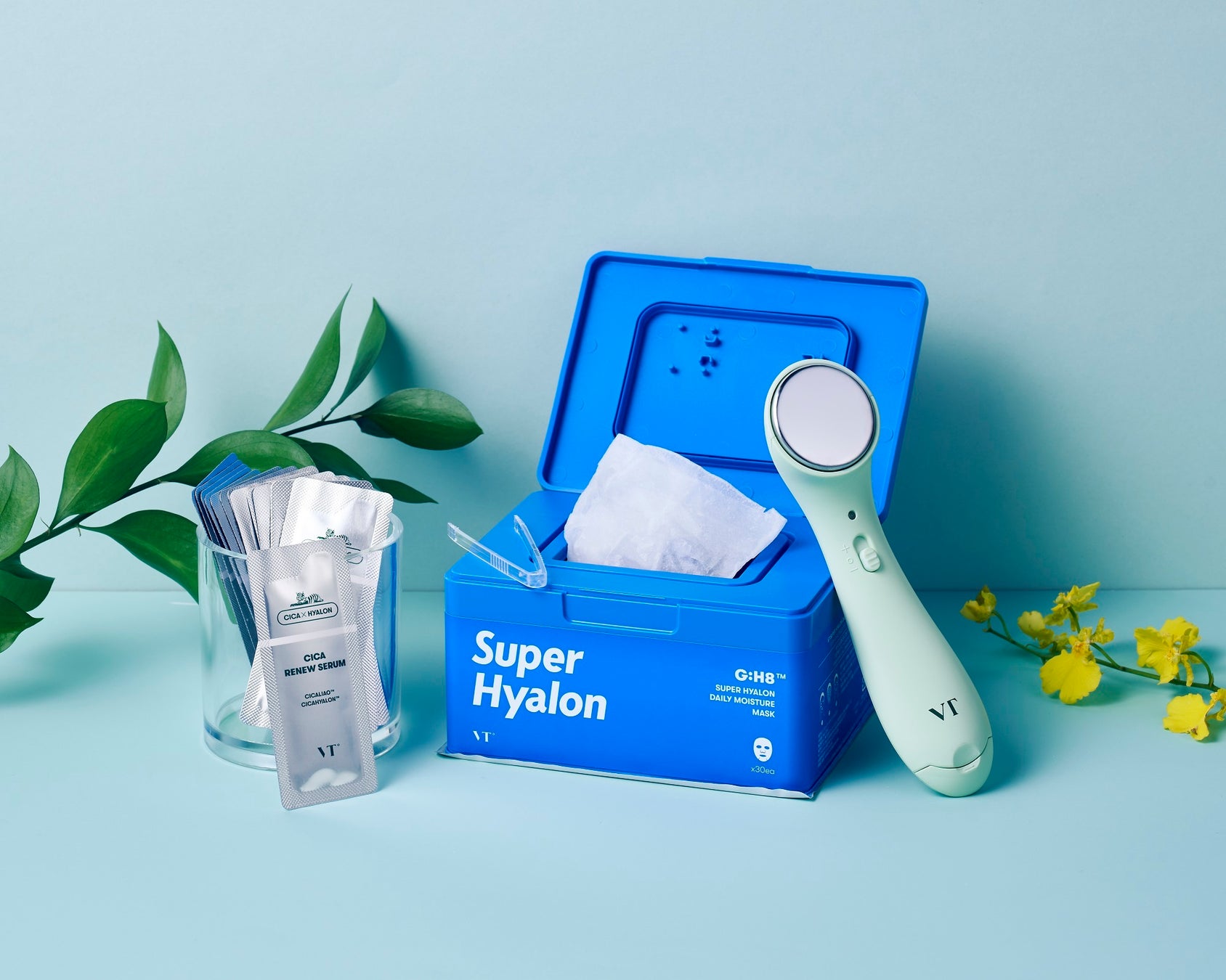 今回のスペシャルアイテムはオリジナルカラーのマイクロカレント美顔器と、VT スーパーヒアルロンデイリーモイスチャーマスク&VT シカリニューセラムからなるスペシャルケアセット。毎日のスキンケアに取り入れやすいアイテムで、もちもち肌に!