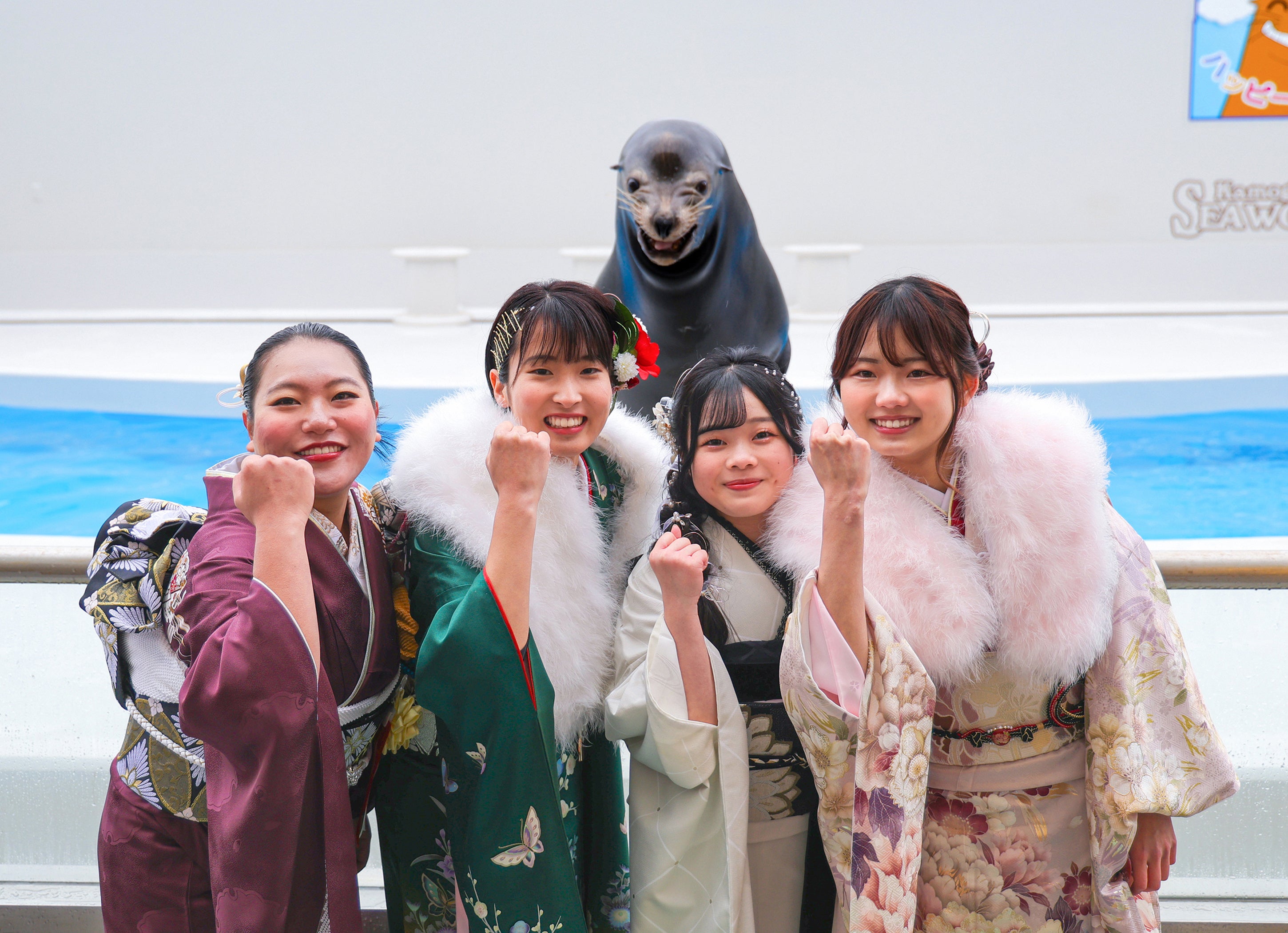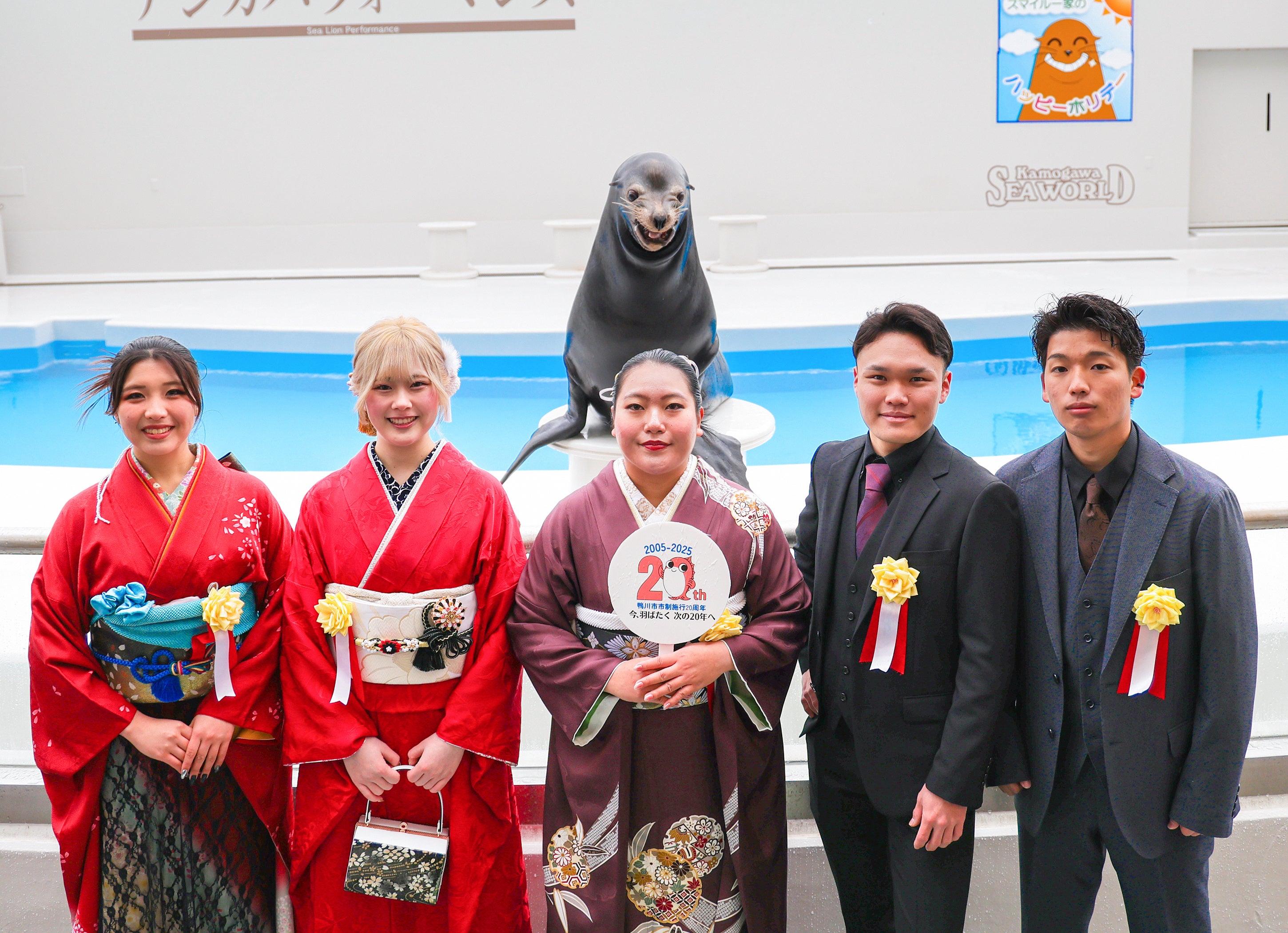 【鴨川シーワールド】水族館での「二十歳の集い」に161名の新成人が参加!笑うアシカ「カンジ」が愛らしいスマイルで祝福!!