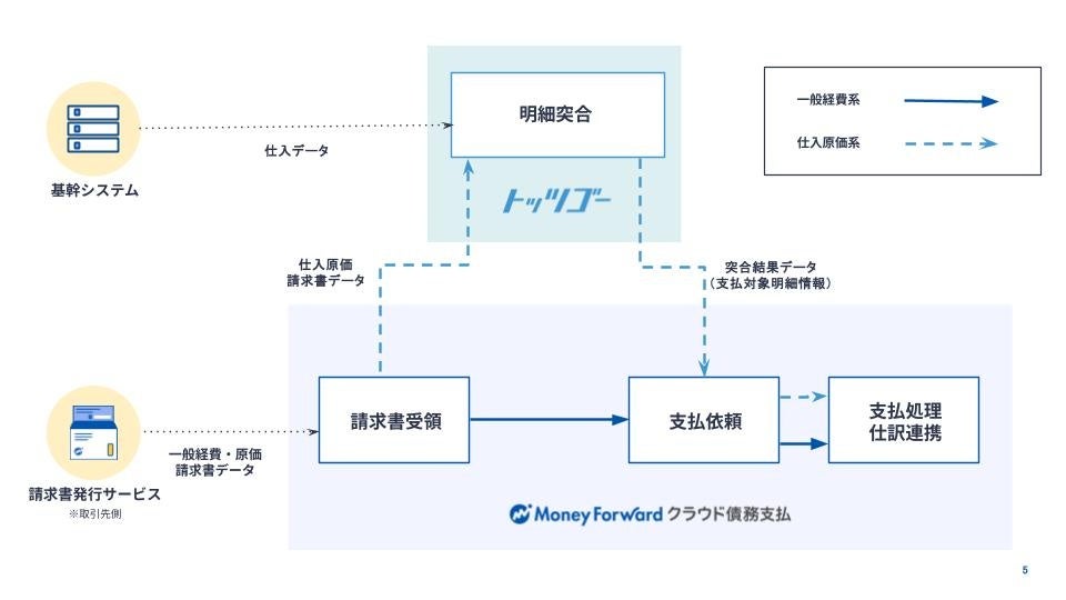 『トッツゴー』は、明細突合ロジックに強みを持つ、製造・卸・小売業向けのクラウド請求書受領・明細突合サービスです。今回のAPI連携により、『マネーフォワード クラウド債務支払』で受領した原価の請求書データを『トッツゴー』へ連携できます。これにより、請求書の受領・データ管理を一元化し、明細突合作業から支払依頼までをワンストップで行うことで、製造・卸・小売業における複雑な請求処理業務を効率化します。