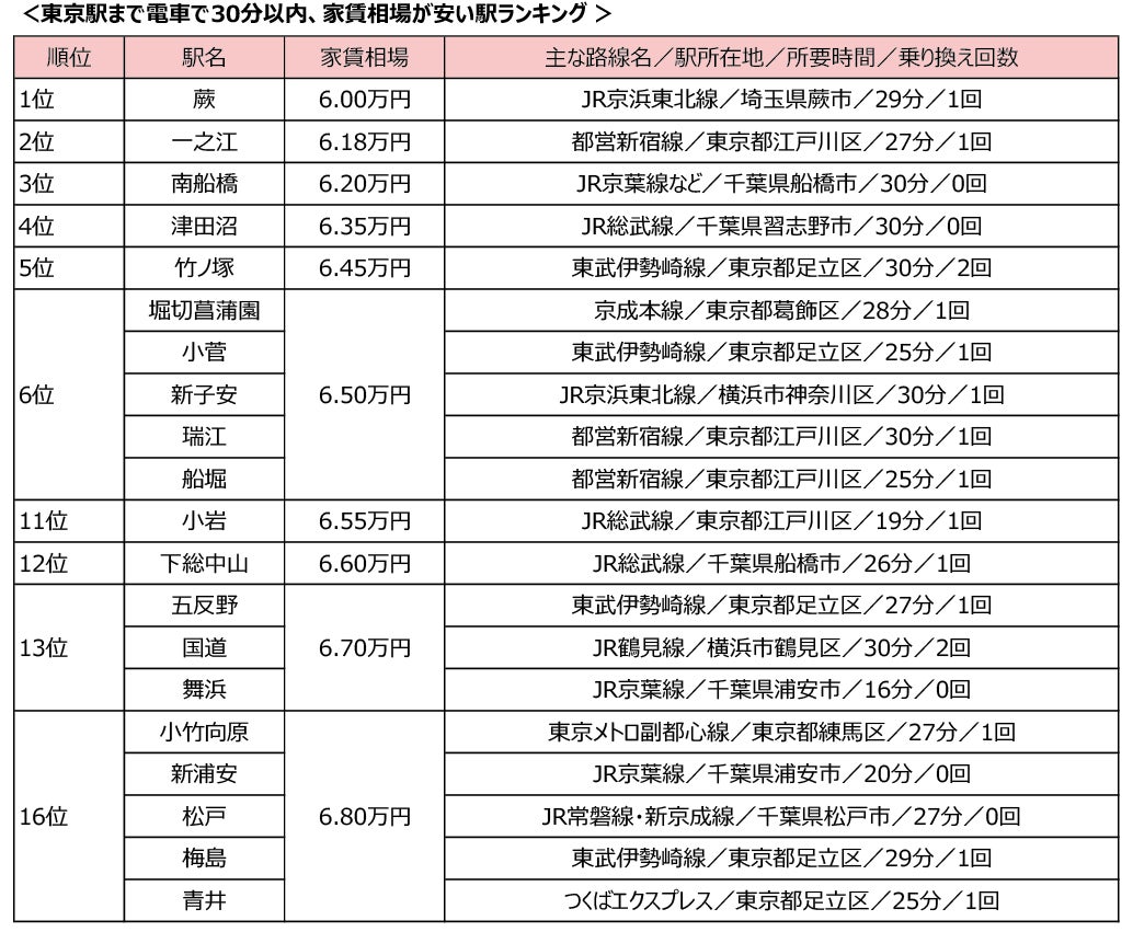 東京駅まで電車で30分以内、家賃相場が安い駅ランキング 1位は埼玉県で唯一ランクインした「蕨」駅!