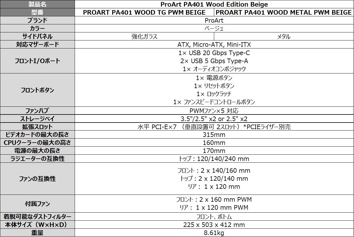 ASUS JAPAN株式会社は、高級感のあるフロント木製デザインにフロントグリルと160mm デュアルファンで冷却性を高め、電源・リセットボタンの誤動作を防ぐロック機構を搭載したクリエイター向けブランドProArtのPCケースのベージュカラーモデル「ProArt PA401 Wood Edition Beige」シリーズを発表。サイドパネルがが強化ガラスのモデルと、販路限定でメタルパネルのモデルを