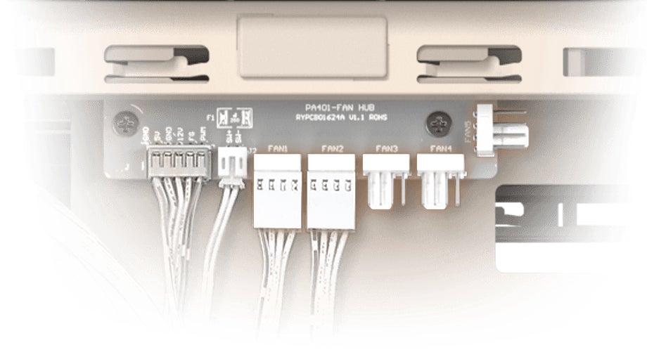 PWMファンハブを搭載することでシステムファンを一か所でまとめて制御。最大5基のPWMファンに対応します。フロントのファンスピードコントロールボタンで制御が可能です。