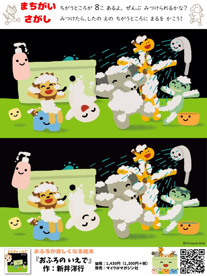 マイクロマガジン社(東京都中央区)は、人気絵本作家・新井洋行先生による絵本『おふろの いえで』のまちがいさがしを公開いたしました。