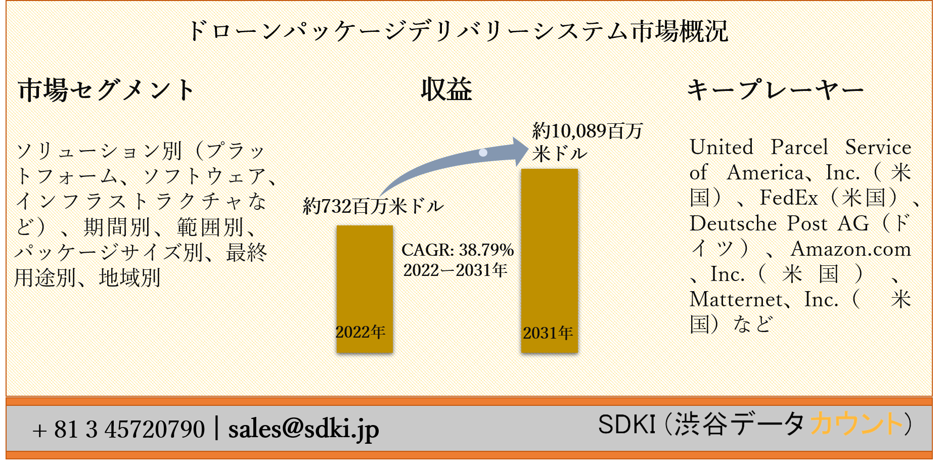 SDKI Inc.が「世界のドローンパッケージデリバリーシステム市場ー予測2022ー2031年」の新調査レポートを2021年12月30日に発刊しました。レポートは、業界の新ビジネスチャンスとともに、市場とその成長見通しの完全な評価を提供します。さらに、2022ー2031年の予測期間中の市場規模と年間成長率が含まれています。