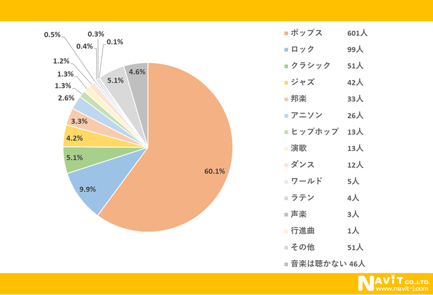 「1番好きな音楽のジャンルは何ですか?」という質問については、「ポップス」が60.1%、「ロック」が9.9%、「クラシック」が5.1%という順になりました。