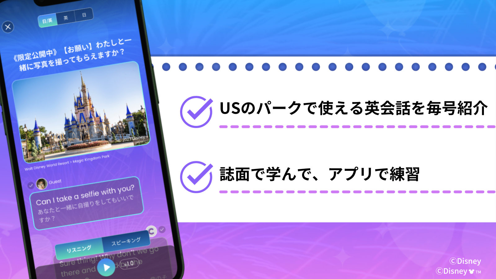 なお、誌面に掲載した会話シーンは「ディズニー ファンタスピーク」の無料エリアにて、音声再生とスピーキングの練習が期間限定で無料でできます。