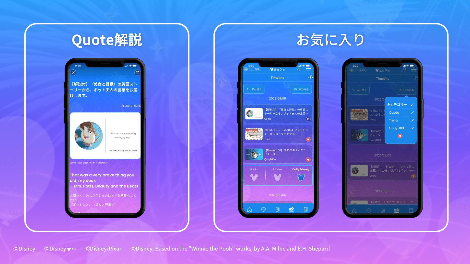 気に入った名言やクイズ、トリビアは「お気に入り登録」機能でまとめて保存でき、「Timeline」で絞り込み表示や、並び替え表示を使って、過去に配信されたコンテンツのお気に入りをいつでもすぐに見返すことができます。