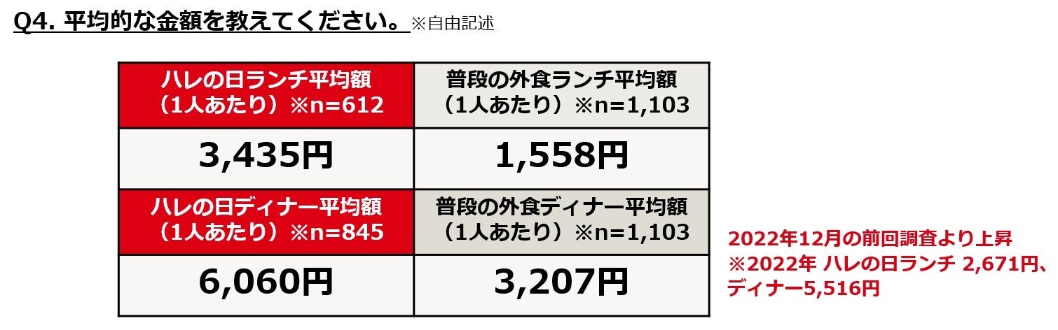 ・予算は、普段のランチ1,558円、同ディナー3,207円、お祝いランチ3,435円、同ディナー6,060円で、いずれも前回調査(22年12月)より上昇。