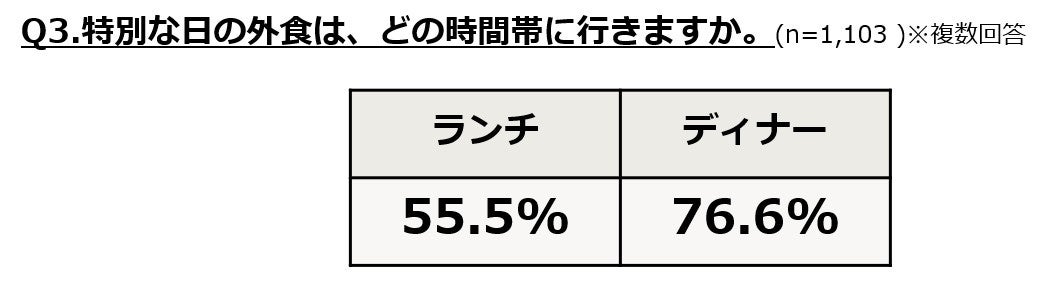・外食する時間帯は、「ランチ」が56%、「ディナー」が77%。