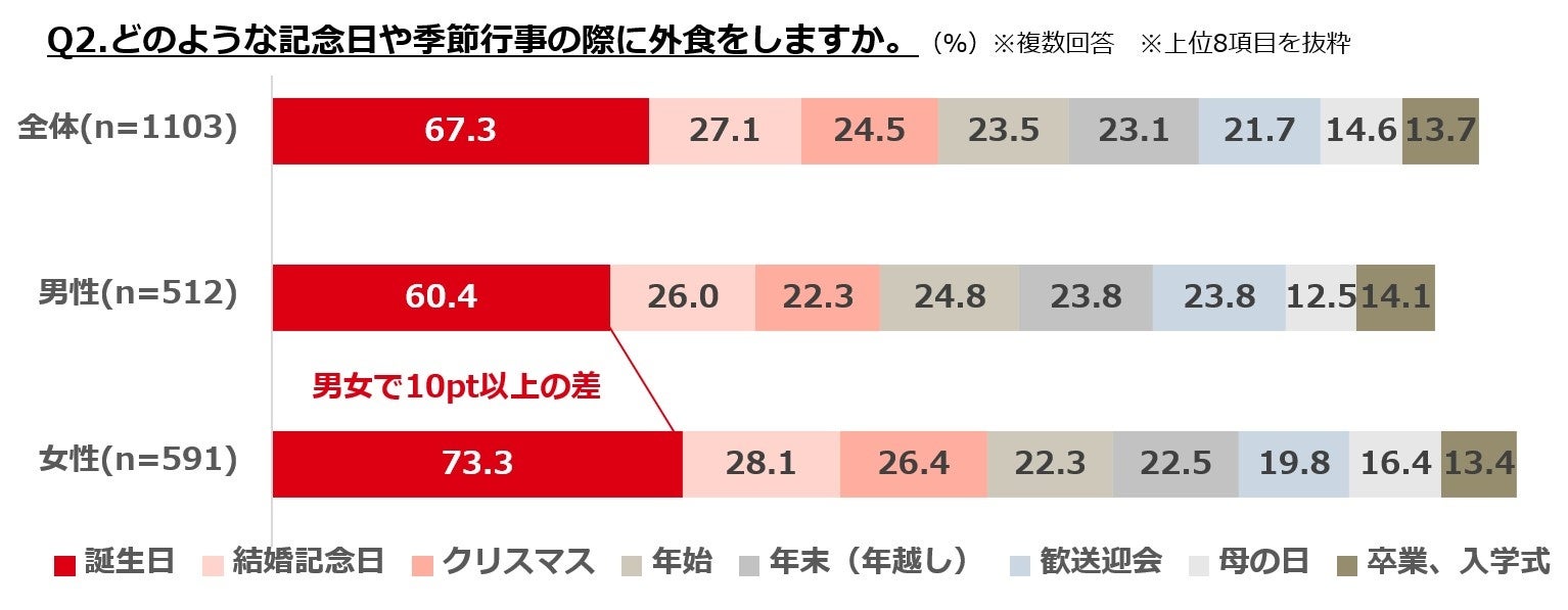 ・外食機会は「誕生日」が7割弱で断トツで、以下「結婚記念日」「クリスマス」などが2割台となる。「誕生日」は男女で10pt以上の差有り。