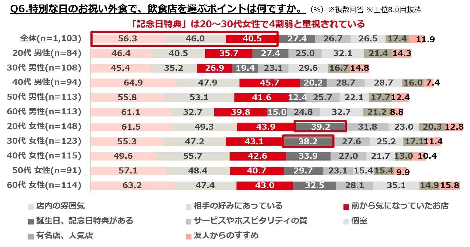 ・店選びの重視点は「店内の雰囲気」「相手の好み」「前から気になっていた店」がTOP3。「記念日特典」は20~30代女性で4割弱と、特に重視されている。