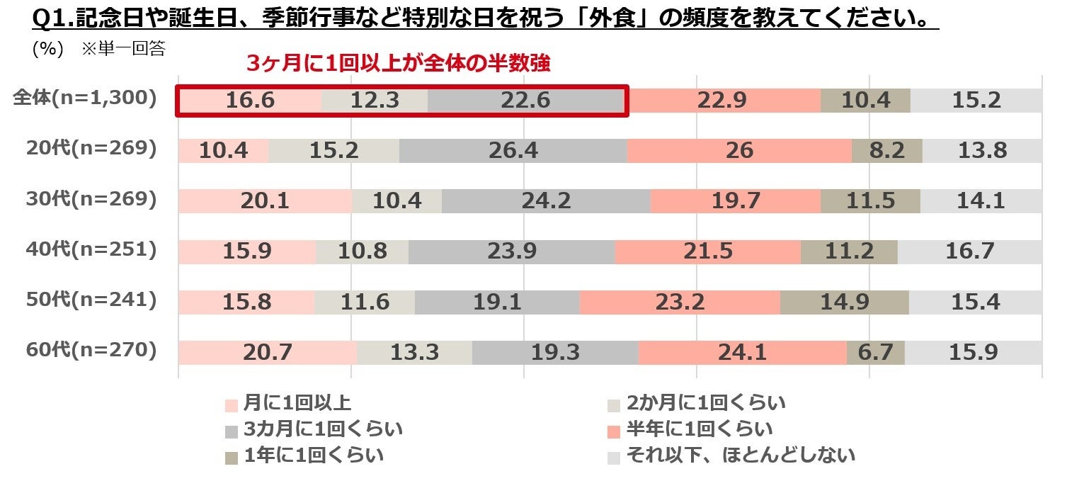 ・お祝い外食の頻度は「半年に1回くらい」と「3ヶ月に1回くらい」が2割強でほぼ同率。3ヶ月に1回以上が全体の半数強。