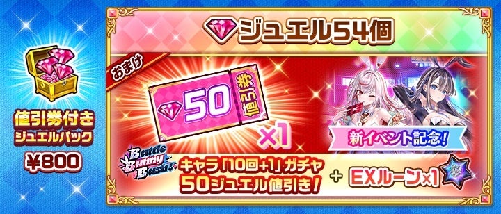 内容物:「ジュエル」400個、「『Battle Bunny Bash!』「10回+1」キャラガチャ ジュエル50個 値引券」1枚、「EXルーン」1個