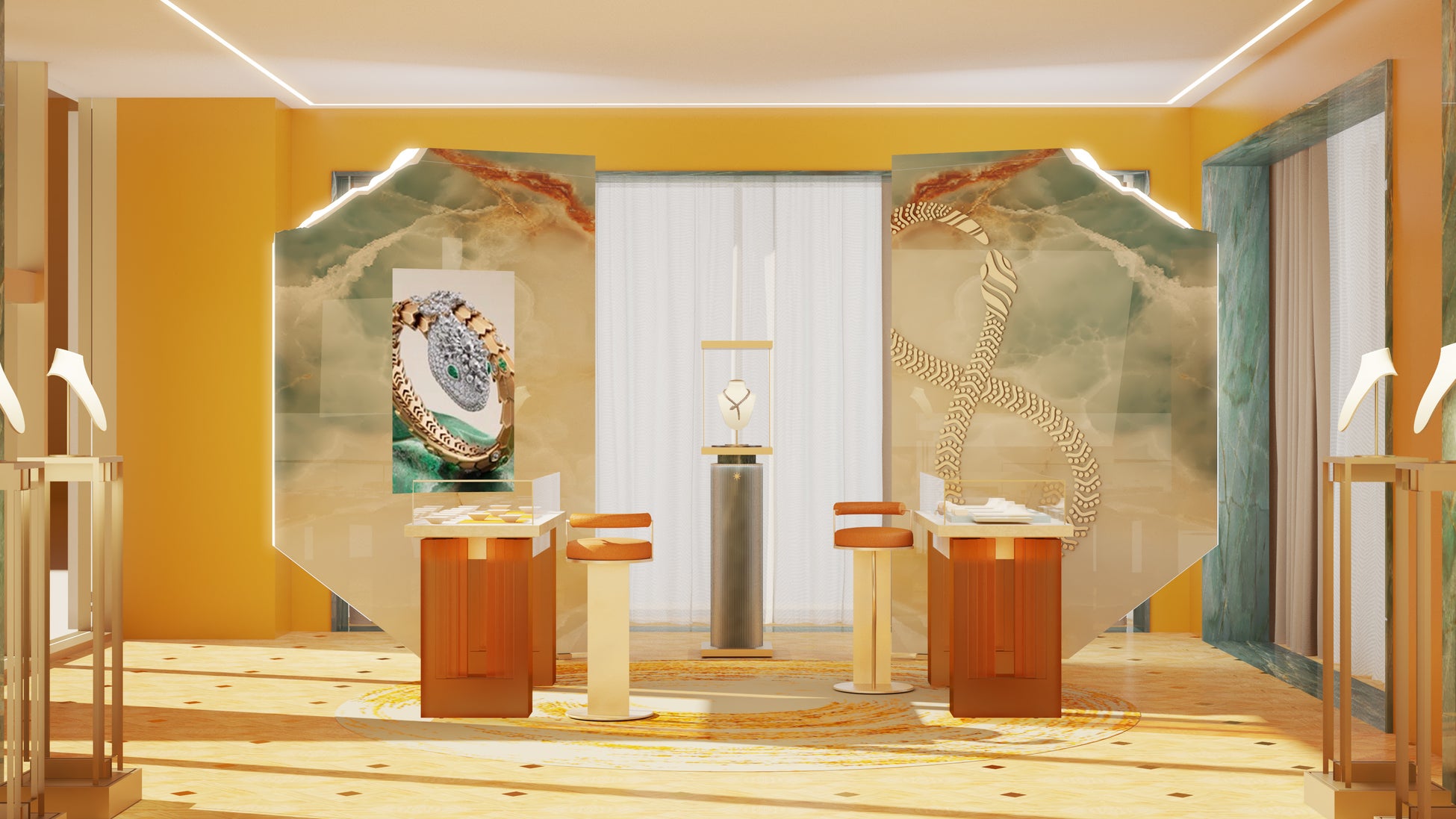 ブルガリの無限の変容の象徴であり、永遠のシンボルであるセルペンティの最新のコミュニケーションコンセプト「セルペンティ インフィニート」のもと、ラグジュアリー、自然、テクノロジーを融合させた空間を演出いたします。その中心部には見事なオニキスの天然板が設けられ、最先端のデジタルコンテンツと「セルペンティ インフィニート」のロゴがみなさまをお迎えいたします。