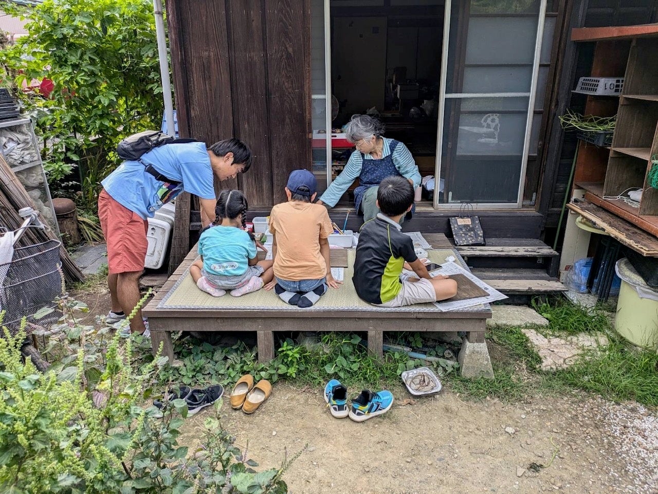リニューアル工事は、専門分野はプロに任せ、キッチンや外構のタイル張りなどできるところは地域の方とDIYで整備しました。公道からエントランスまでのアプローチには、「アイコンづくりワークショップ」で地域のこどもたちが作成した農作物や昆虫など、もくりからイメージする手描きの絵が並び、入りやすい雰囲気を作り出しています。