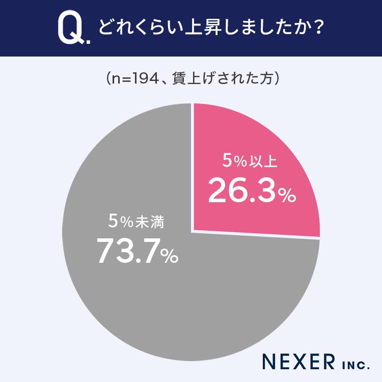 「5%以上」賃上げされた方が26.3%いる一方で、「5%未満」は73.7%の方が回答しています。