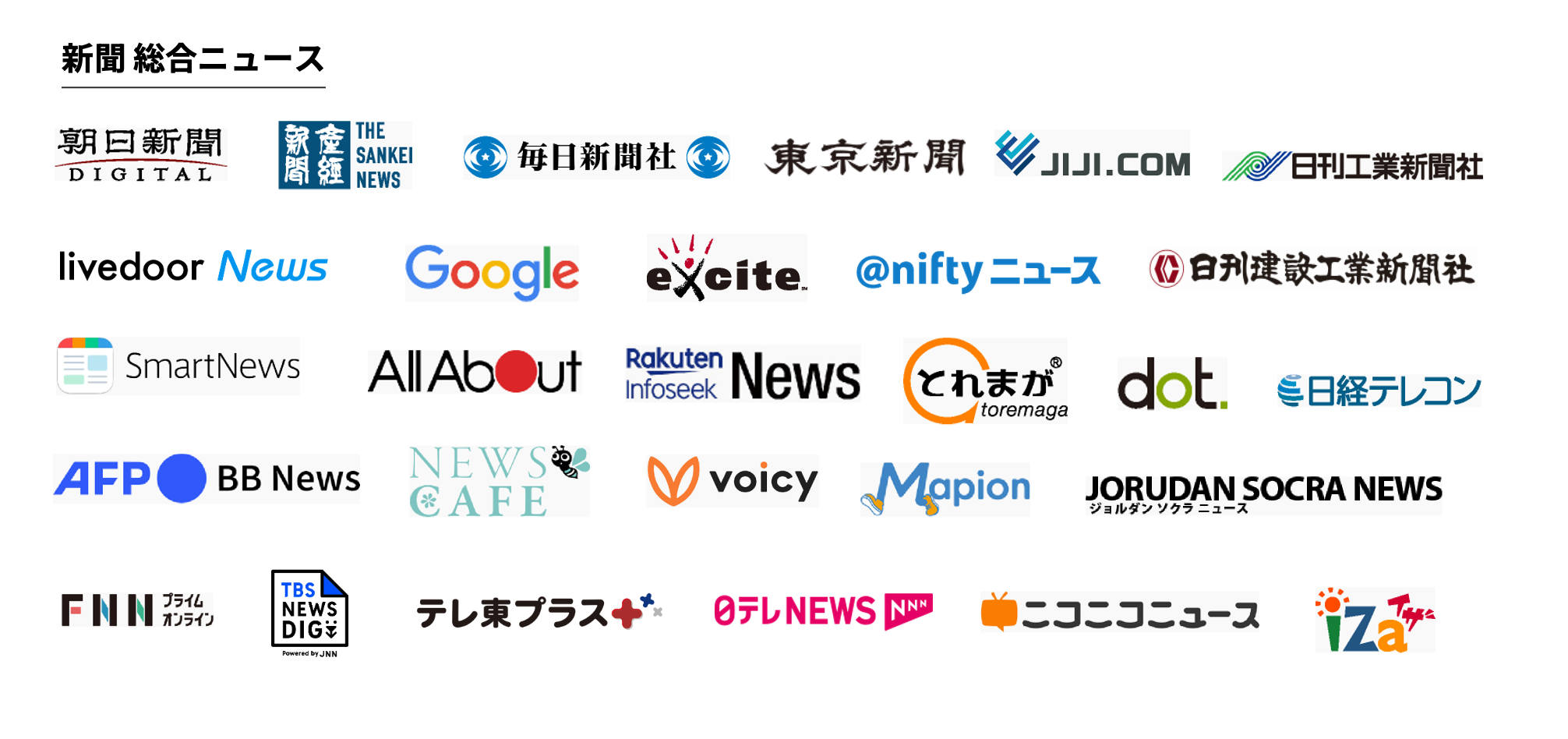 今回の「ライブドアニュース」との連携開始に伴い、「PR TIMES」パートナーメディアは総計267メディアとなりました。なお「ライブドアニュース」のように、プレスリリースのジャンルや業種等に関わらず、広く掲載対象としていく「新聞総合ニュース」カテゴリのパートナーメディア数は、合計28メディアです。