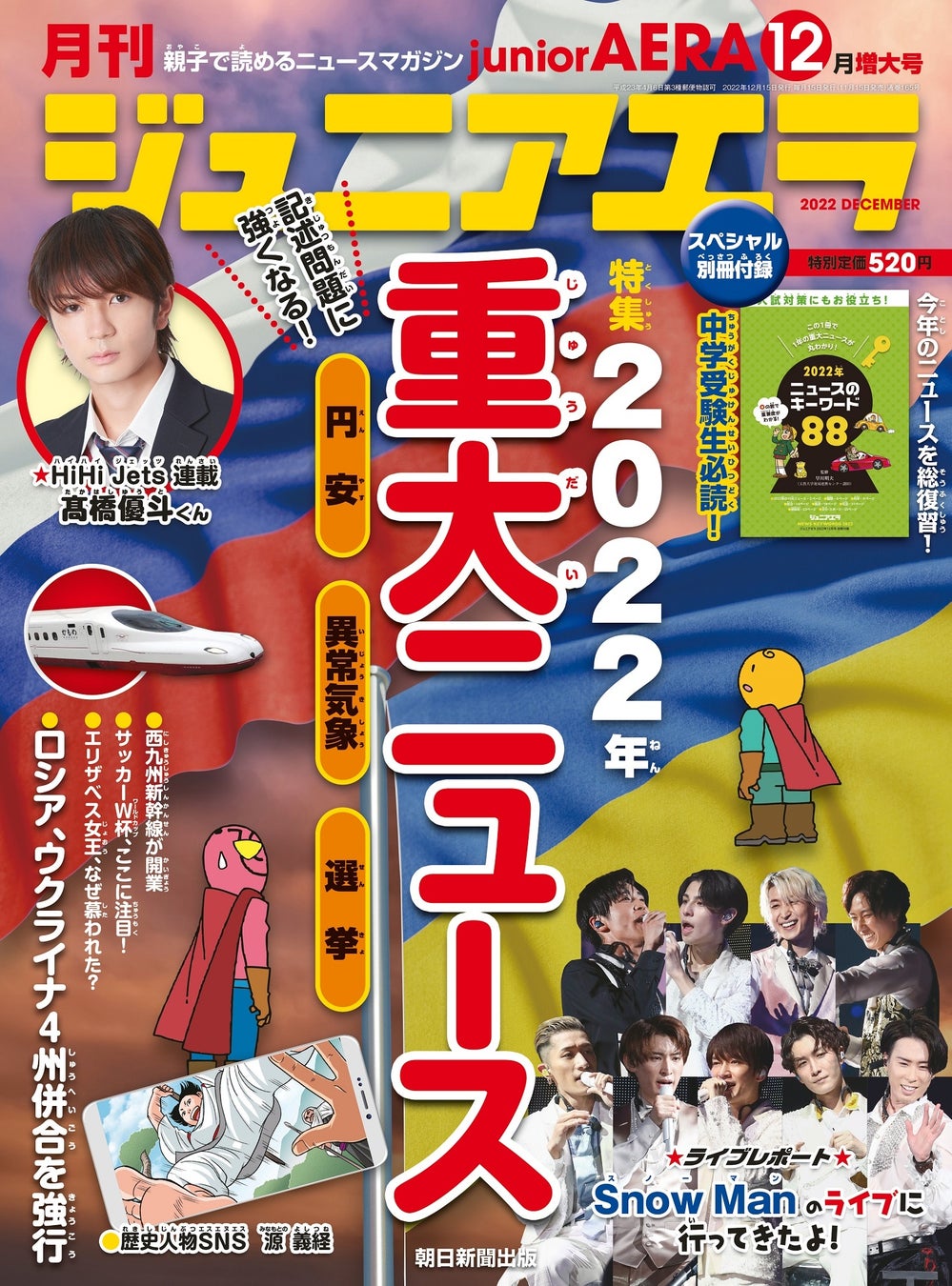 小中学生が親子で読めるニュース月刊誌「ジュニアエラ12月号」が2022年11月15日(火)に発売されました。12月号の特集は「中学入試の記述問題に強くなる!2022年 重大ニュース」。特別付録に「2022年ニュースのキーワード88」もつきます。ニュース解説では、「ロシア、ウクライナ4州併合を強行」「サッカーW杯、ここに注目!」「西九州新幹線が開業」などをわかりやすく解説します。スペシャル企画として、ジャニーズの人気グループSnow Manのライブレポート&撮りおろし写真も掲載。HiHi Jets連載は、髙橋優斗くんが登場します。中学受験に役立ち、学びと楽しさがつまった一冊です。
