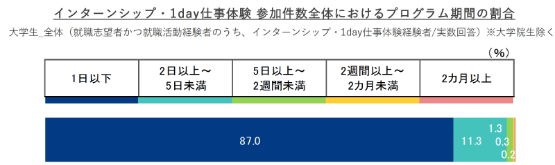 学生が参加したインターンシップ・1day仕事体験の件数全体のうち、「1日以下」のプログラムは87.0%、そのうち就業体験が含まれていたプログラムは25.4%