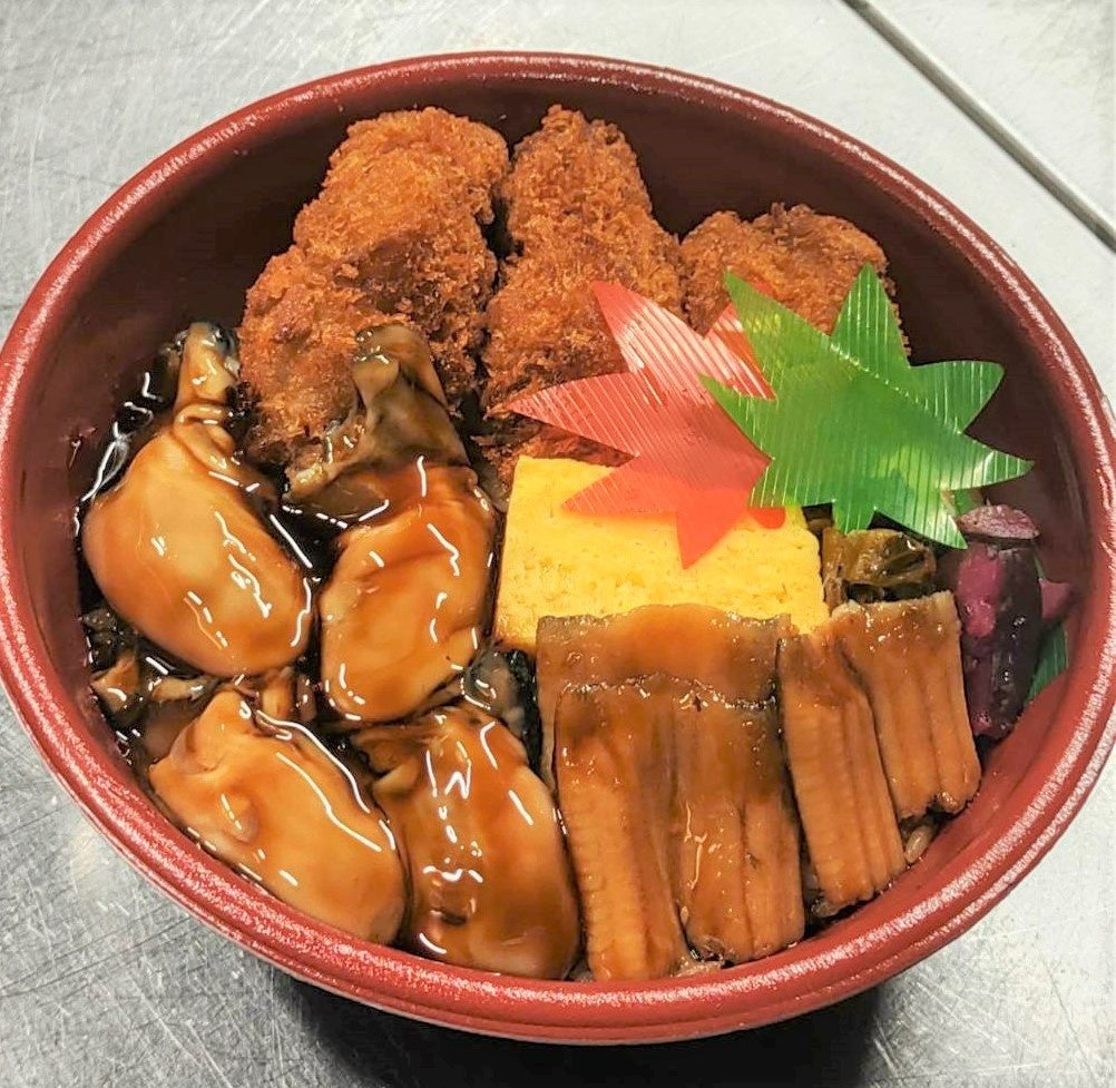 瀬戸内海で育った牡蠣の出汁で炊いた“かきめし”の上に、プリプリ食感の煮牡蠣とカキフライをのせた牡蠣づくしの丼!ふっくらと柔らかな煮穴子と広島菜のお漬物も添えて。
