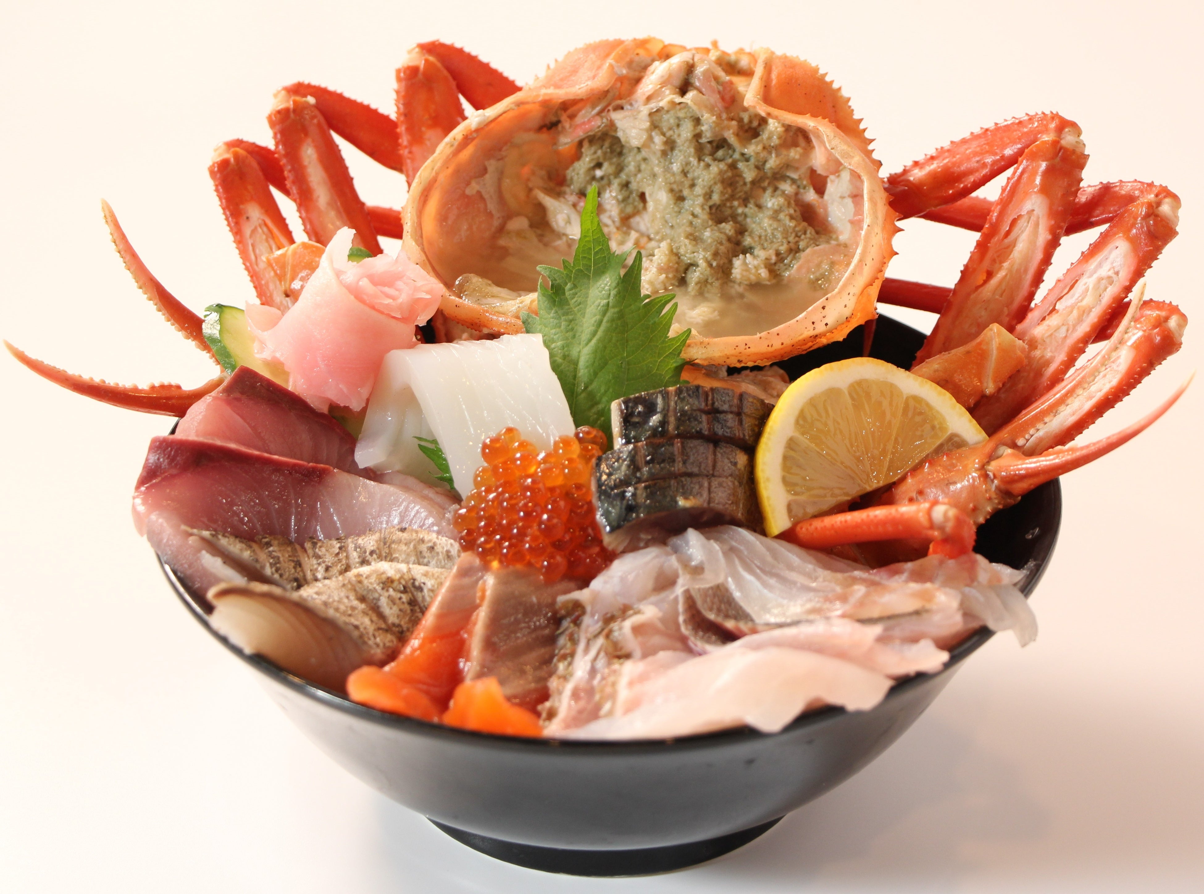 ベニズワイガニが1匹丸ごと鎮座!その周りを境港で水揚げされた新鮮な魚介で囲んだ、まさに“てっぺん”の名にふさわしい贅沢海鮮丼です。