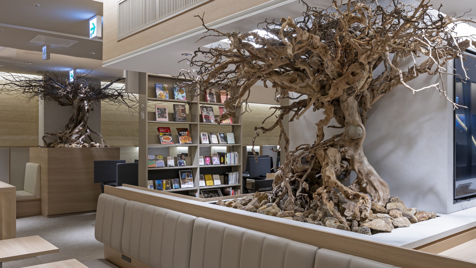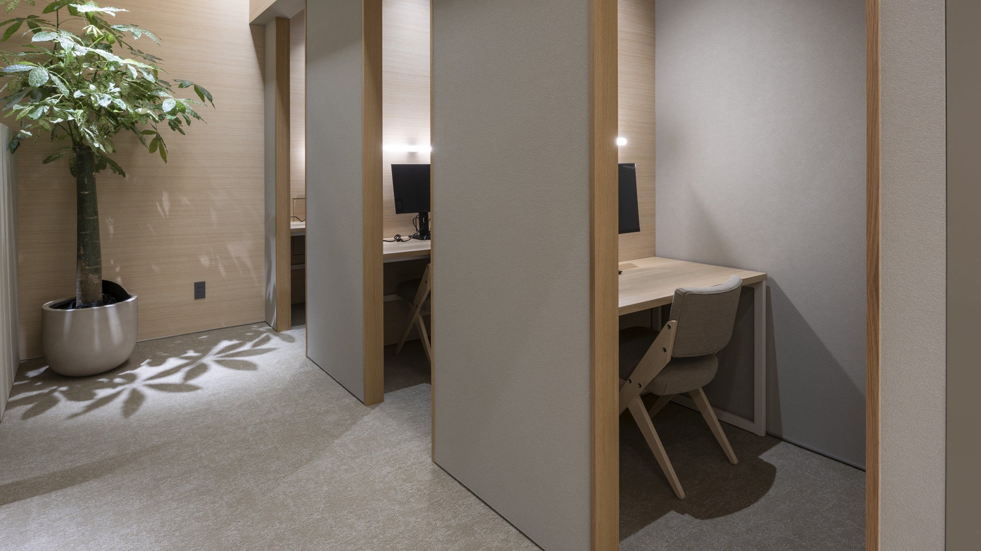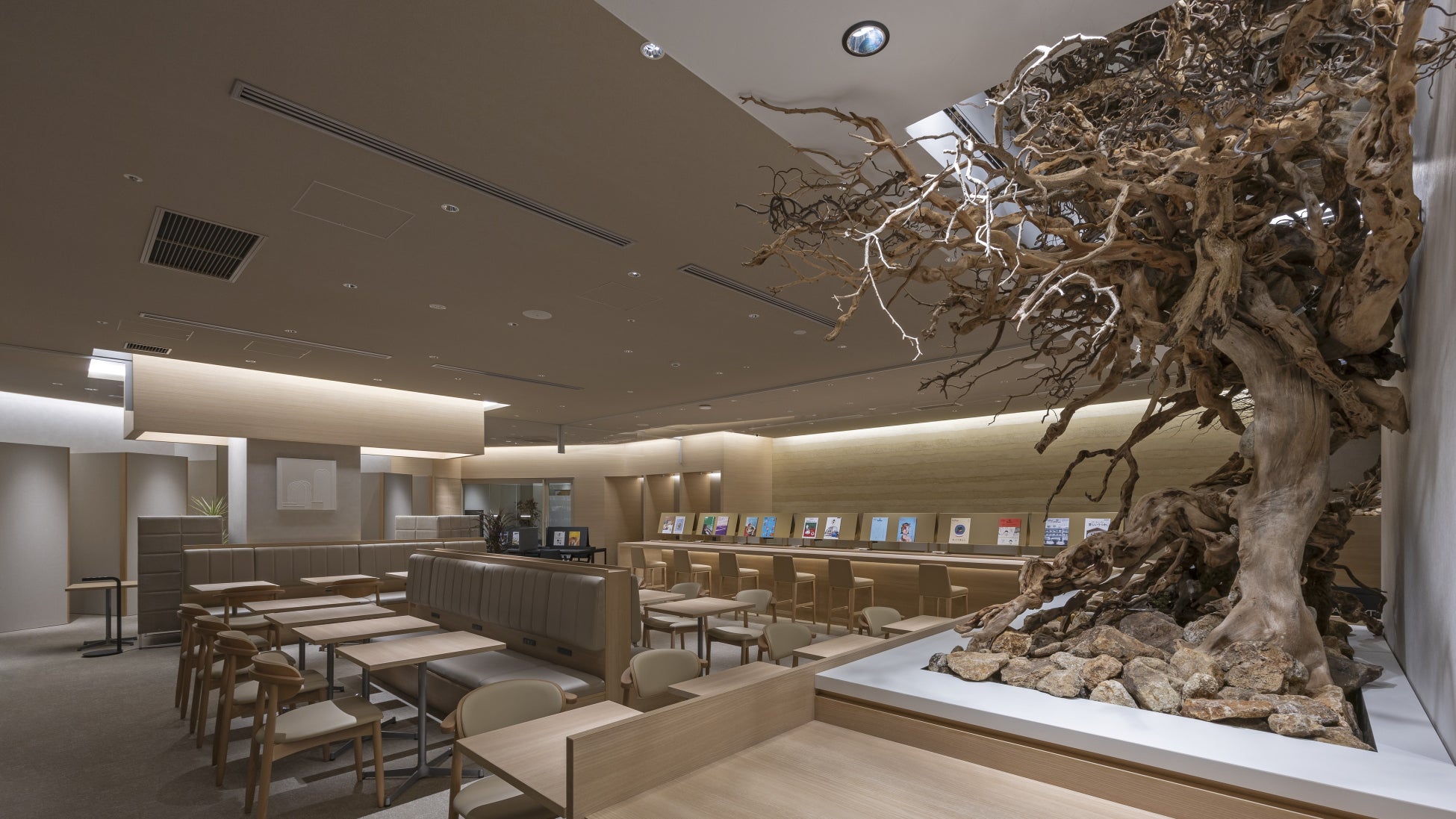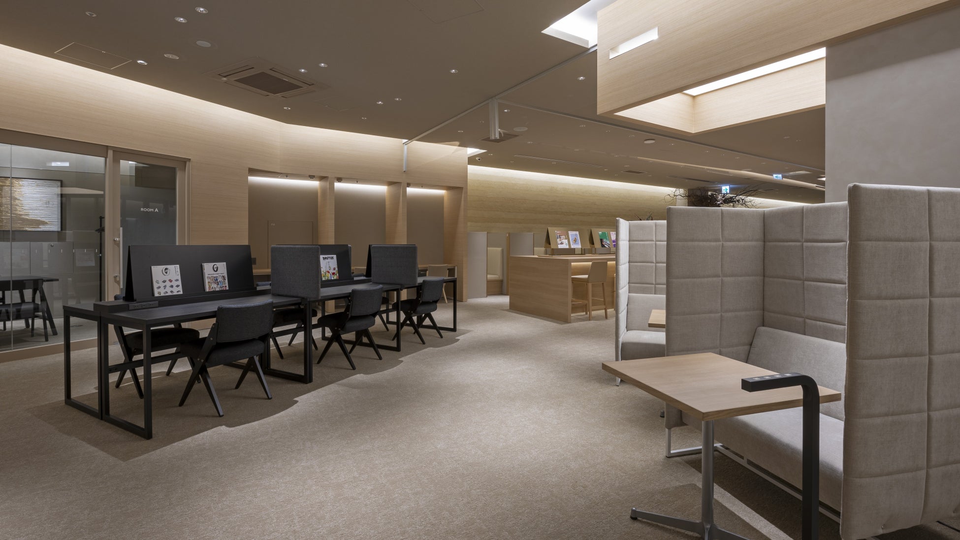 「SHARE LOUNGE 駒沢大学駅前」は、地下1階に位置しながらも、壁面に地層をイメージした左官仕上げやボタニカルアートを施すことで、自然の息吹を感じられる落ち着いた空間に仕上げています。さらに、施設全体が「こもれび」や「グリーン」をテーマに設計された「KOMAZAWA Park Quarter」の一部として、ラウンジ内にも植栽やこもれび照明を取り入れ、地下であることを忘れるような開放感と自然の温もりを演出しています。