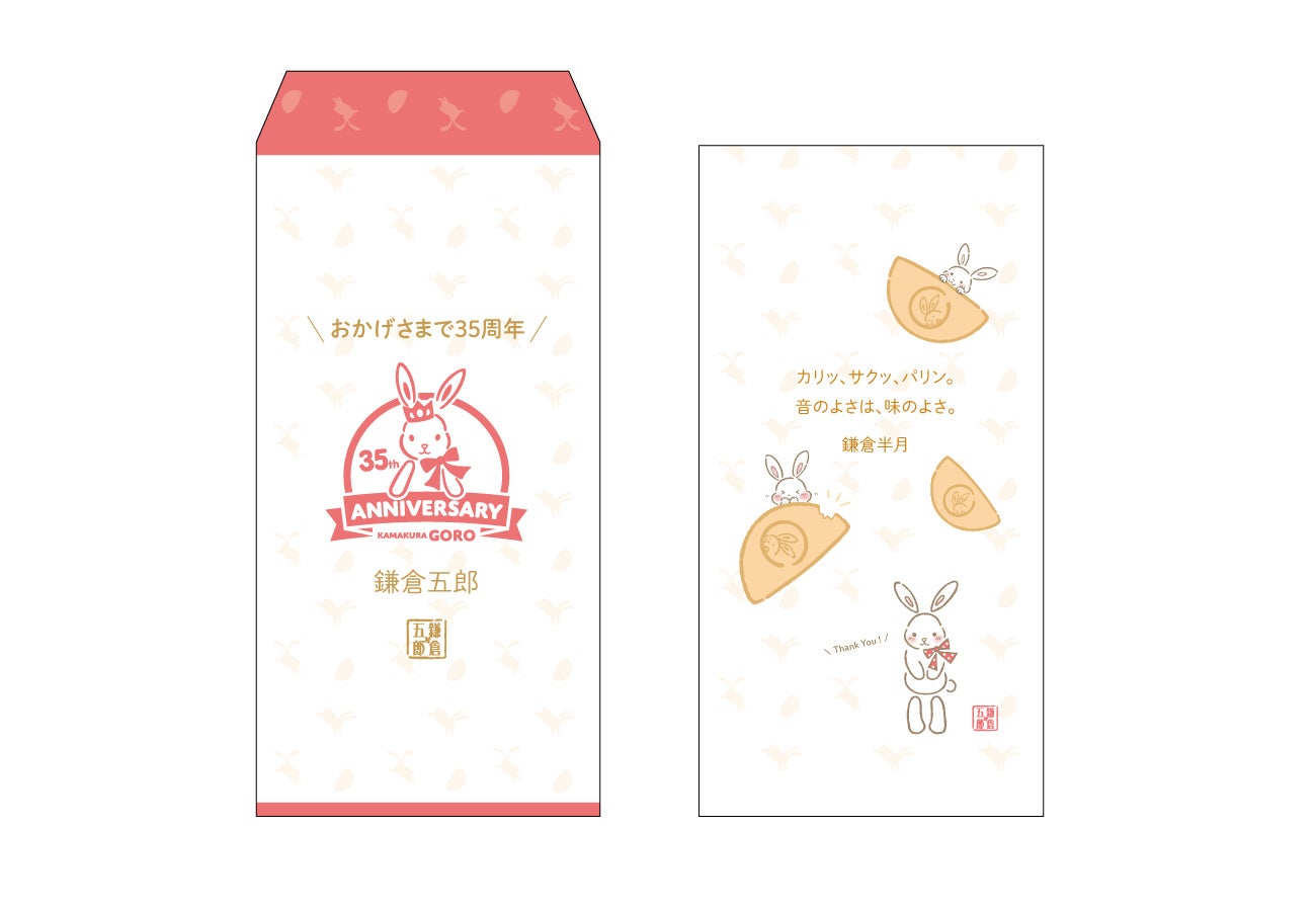 鎌倉五郎本店を代表する、大人気の鎌倉銘菓といえばコレ!月うさぎを描いた大きな半月のおせんべいに、ふわっと軽いクリームがたっぷりはさまれた『鎌倉半月』です。カリッと「おいしい音」がする、ほかにない香ばしい食感は、お子様からご年配まで圧倒的支持をうけています。鎌倉五郎ウィークのために用意した、かわいい半月袋に入れてお渡しいたします。