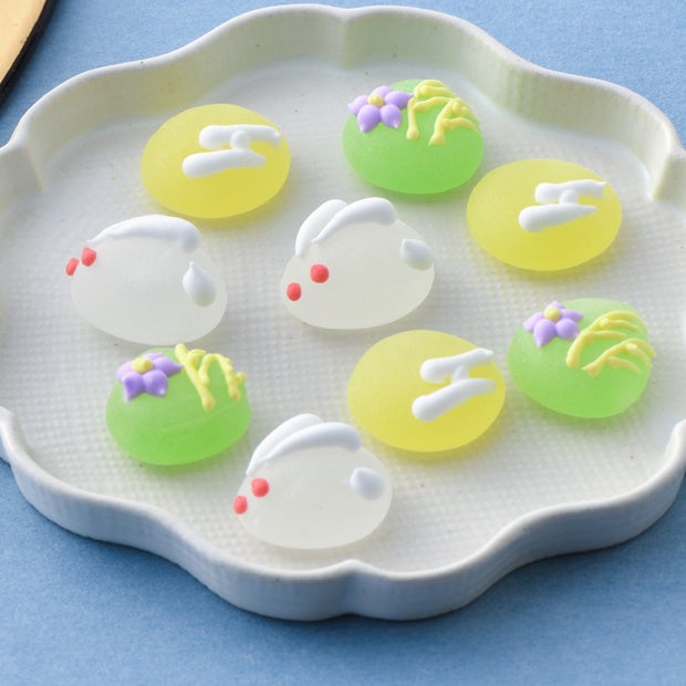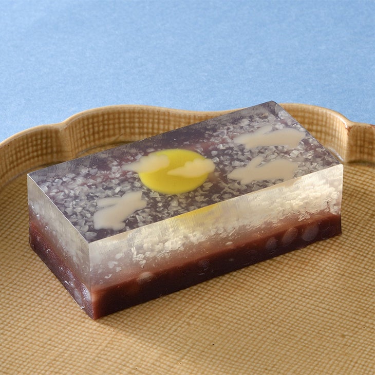中秋に輝く満月に軽やかに跳ね遊ぶうさぎの愛らしい姿を、三層の細工羊羹で表現しました。