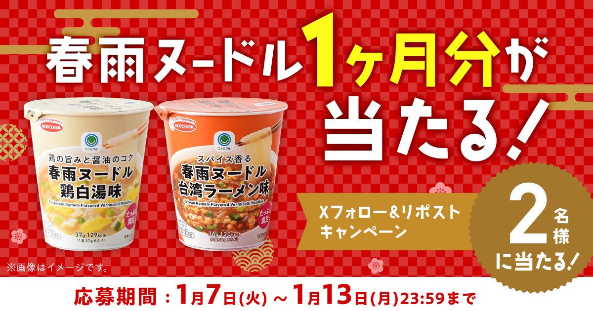 期間中、ファミリーマート公式X(Twitter)(@famima_now)をフォローのうえ、対象のポストをリポストすると、抽選で2名さまに「ファミマル 春雨ヌードル 鶏白湯味」と「ファミマル 春雨ヌードル 台湾ラーメン味」が1ヶ月分(鶏白湯味・台湾ラーメン味 各15食分、計30食分)が当たるキャンペーンを開催いたします。
