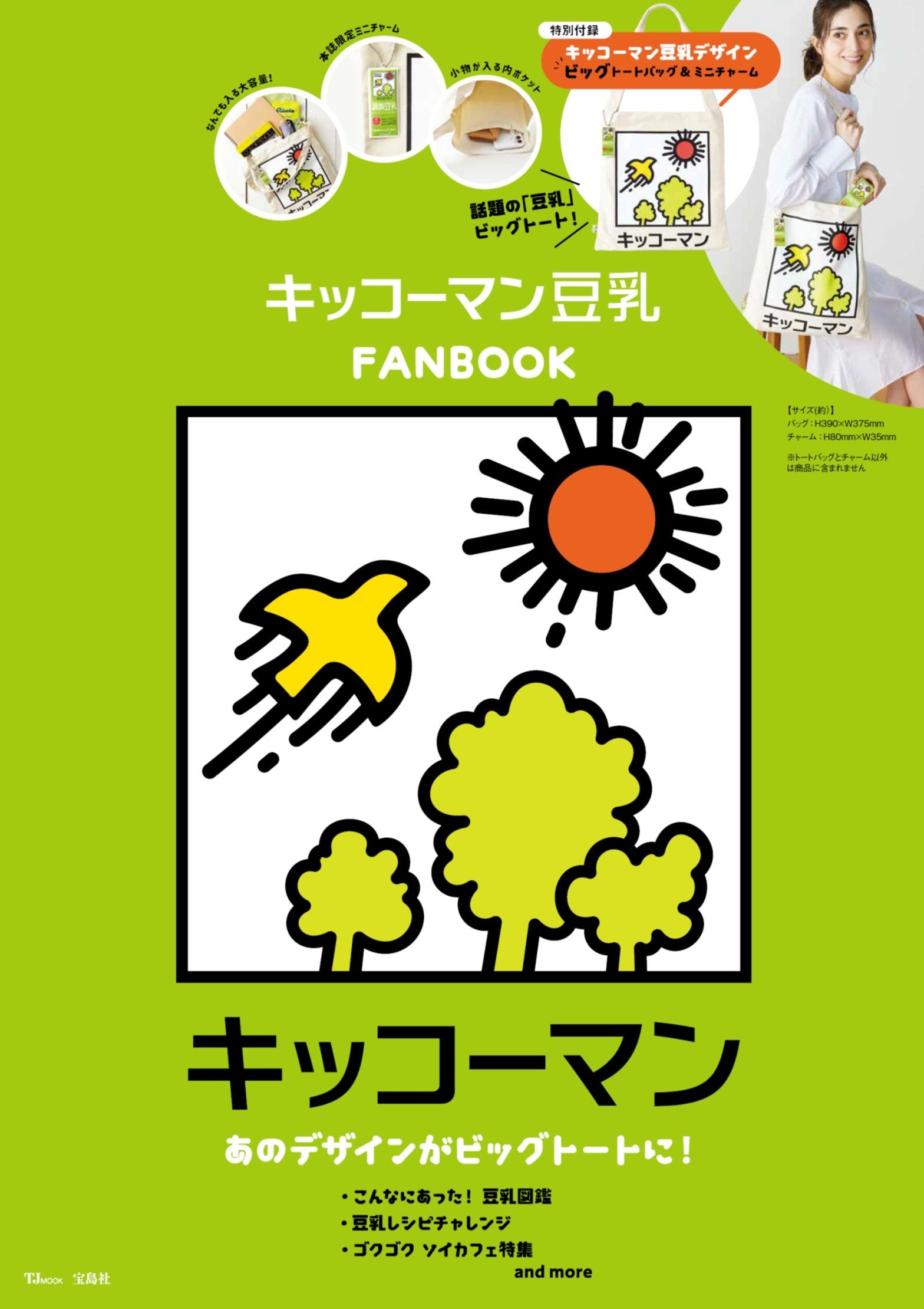 今回のコラボバッグは、豆乳をイメージした生成りの生地に、ポップなマークが映えるデザインで、折りたたみ傘やA4ノートなどがすっぽり入るビッグサイズです。鍵やスマホなどを収納できる内ポケット付きなのもうれしいポイント。また、実物の豆乳のパッケージにそっくりなミニチャームがセットになっています。裏側は反射材になっており、夜道でも活躍するチャームです。誌面では、バリエーション豊かなキッコーマン豆乳図鑑や豆乳アレンジレシピの紹介など、豆乳好きな方必見の内容となっています。