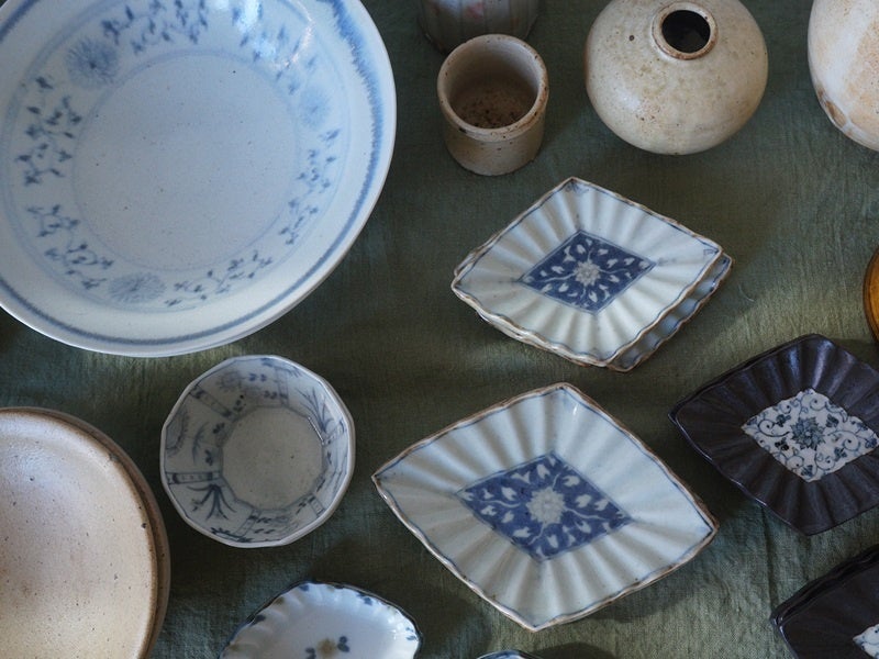 益子の土の味わいを存分に生かした、中村恵子さんの器。今回は深緑・インディゴ釉・水色・黒釉・粉引(アイボリー)の色調を中心に、おうちご飯〜軽いお茶など、様々なシーンで使用できる器を制作していただきました。