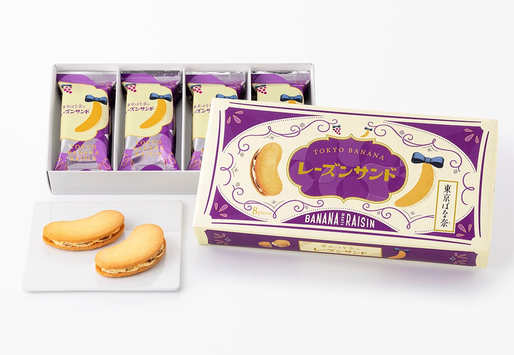 2020年発表の「東京ばな奈総選挙(※)」で定番の『東京ばな奈」を超えて、見事第1位に輝いた、知る人ぞ知る銘品の『東京ばな奈のレーズンサンド』。食べ応えのあるサクッと食感のばな奈型クッキーに、ぷちっと弾けるような食感が魅力のラムゴールデンレーズンとバナナ香るホワイトショコラクリームをサンドしました。クッキーは日が経つにつれてしっとりと変化していく食感にも注目です。