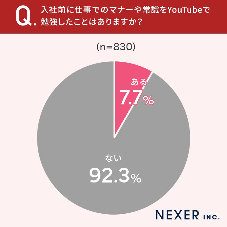7.7%の方が、入社前に仕事でのマナーや常識をYouTubeで勉強したことが「ある」と回答しています。