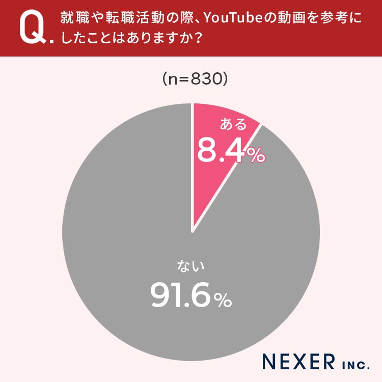 普段からYouTubeを見る方の8.4%が、就職や転職活動の際にYouTubeの動画を参考にしたことが「ある」と回答しています。