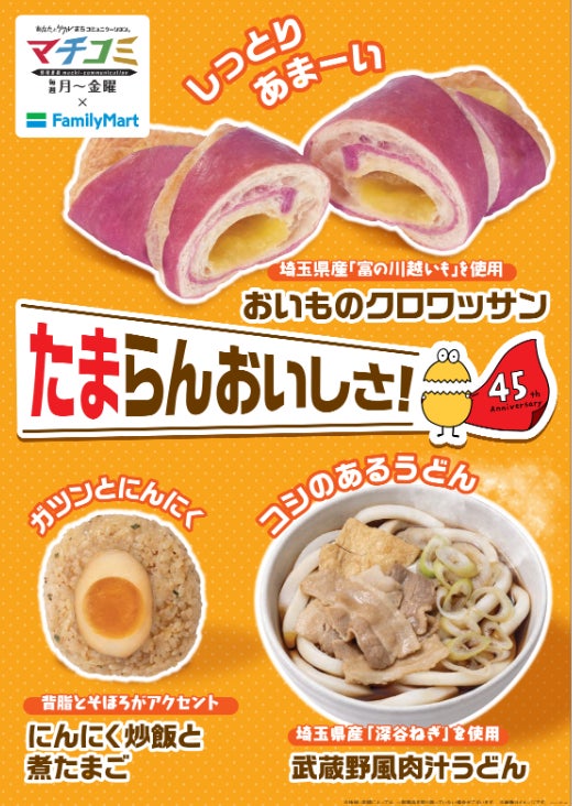 今年度開局45周年を迎えたテレビ埼玉と、1973年に埼玉県狭山市に1号店を開店したファミリーマートは、テレビ埼玉の「情報番組マチコミ」とのコラボ商品を開発しました。埼玉に縁のあるファミリーマートとテレビ埼玉がコラボするのは今回が初めてとなります。埼玉県には数多くの特産物や農産物が存在するため、今回の商品では一部に埼玉県産食材を使用し、埼玉県民に愛される商品を目指しました。また、埼玉県だけに留まらず周辺地域にも「たまらんおいしさ!」をお届けしたく、首都圏全域で発売いたします。