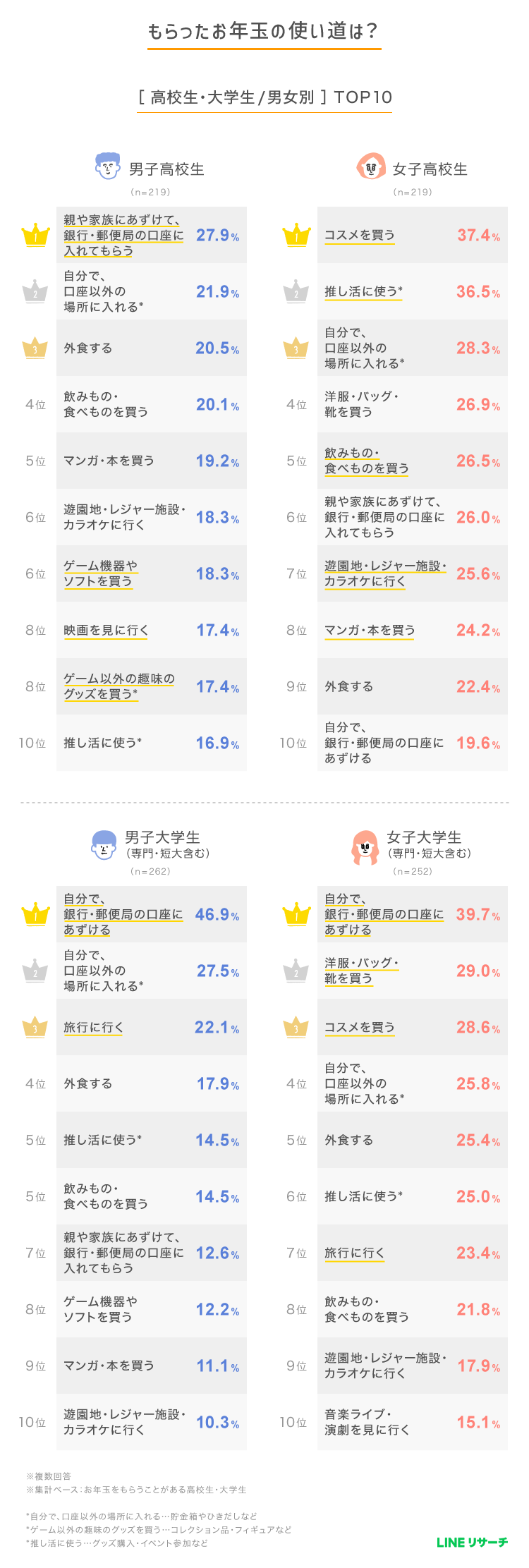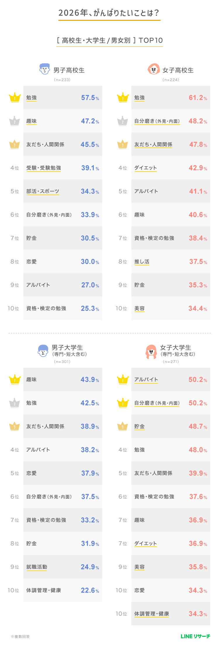 【LINEリサーチ】2026年にがんばりたいこと、高校生・大学生ともに「勉強」が1位!お年玉を「毎年もらっている」高校生は8割超、大学生も7割台