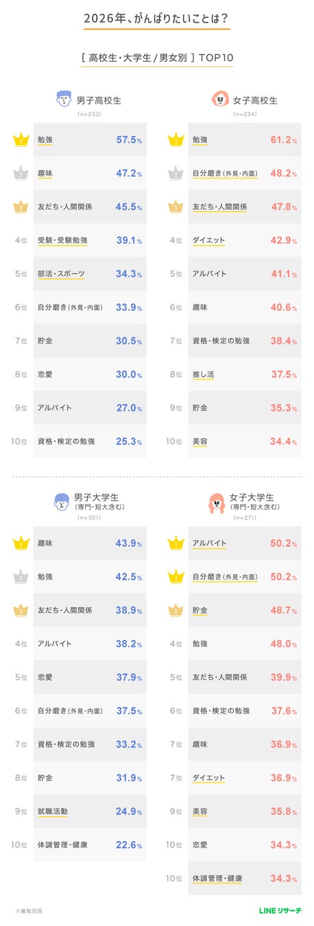 高校生・大学生ともに、2026年にがんばりたいことは「勉強」を中心に、人間関係や趣味、アルバイト、自分磨きなどに関する具体的な声が寄せられました。