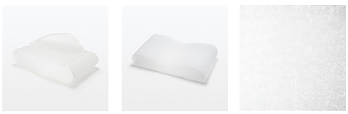 仰向け寝、横向き寝のいずれの寝姿勢もスムーズに受け止める、高さと硬さの形状にデザインしました。中央部分は、サイドに比べて低めで柔らかい触感にし、仰向け寝の際に首が自然な角度になるよう設計しています。横向き寝の時には、首から背骨までが真っすぐの姿勢になり、肩が圧迫されないことが望ましいと言われており、両サイドは高さと硬さを出しました。また、首を支える部分は、重量への耐性を持たせ、短期的な使用によるへたりに繋がらないよう、内部の繊維密度を上げました。(サポートパーツ)。
