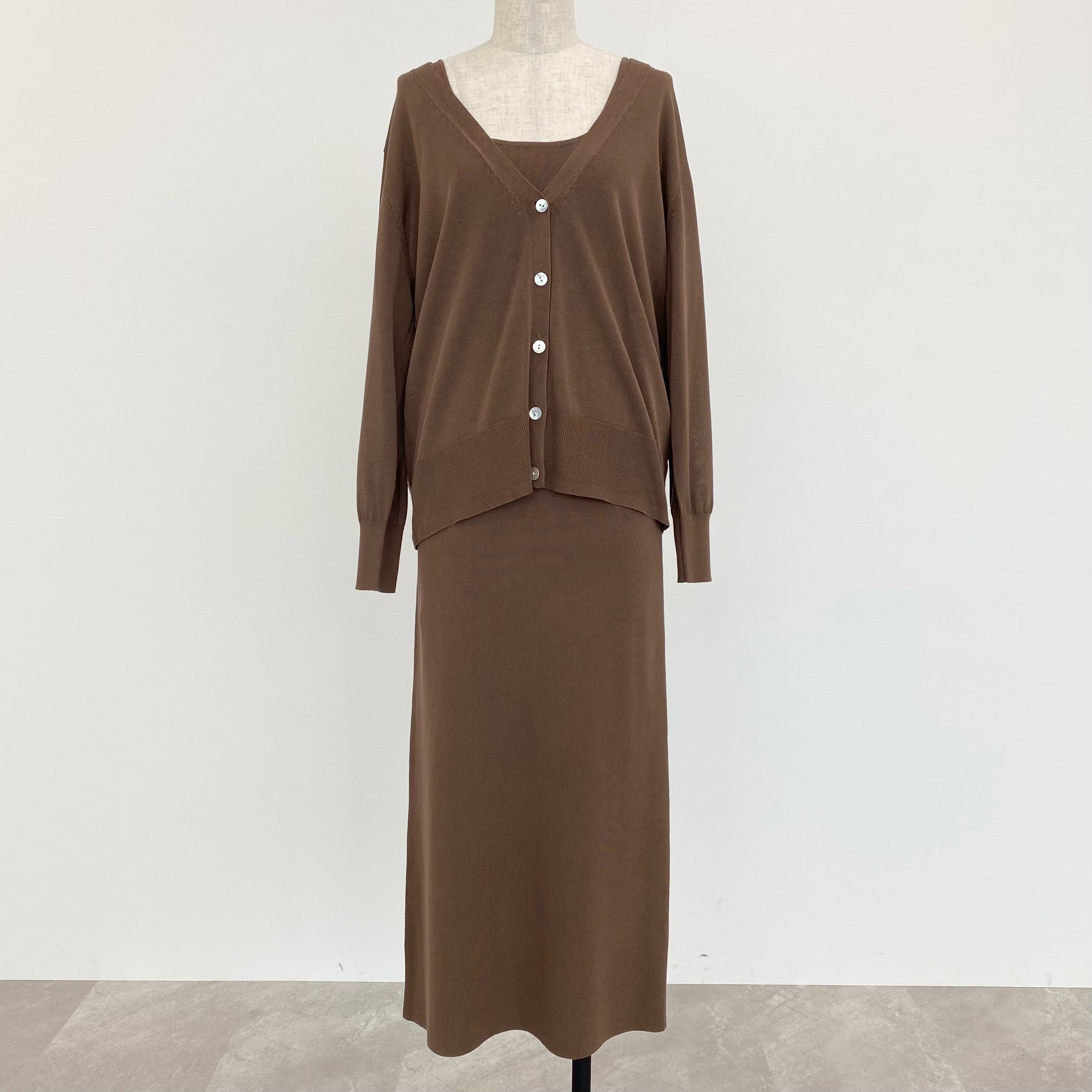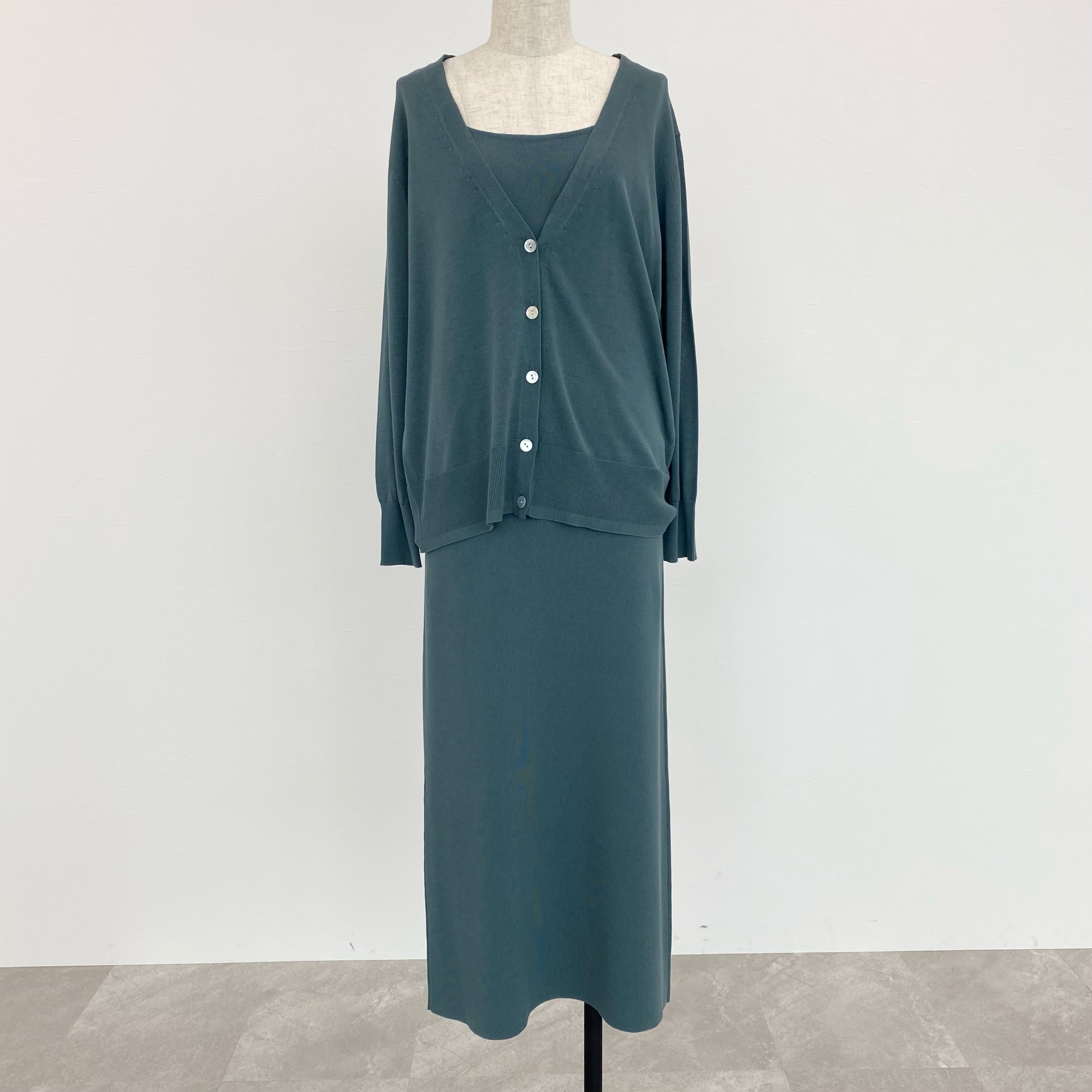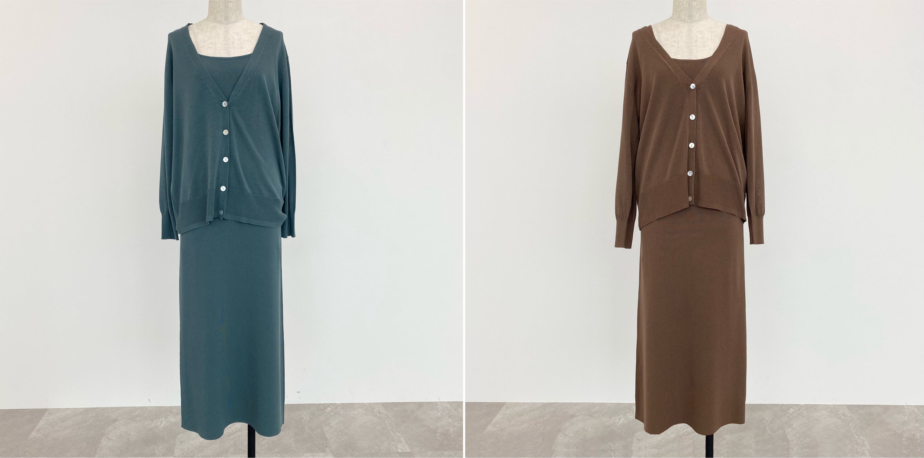 薄手で伸縮性の高さが特徴のコットンアセテートを使用した、カーディガンとノースリーブワンピースのセットアイテム。