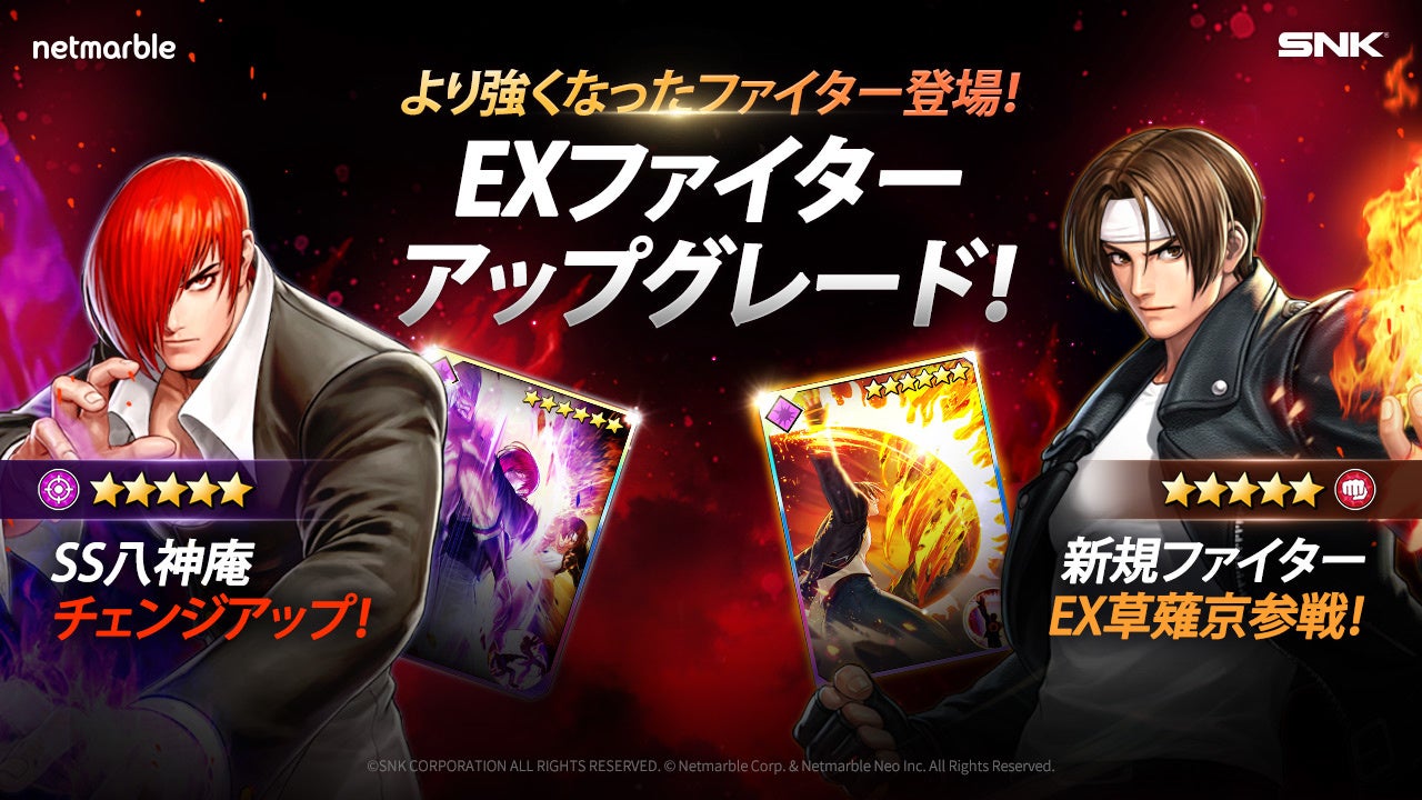 新登場の「EX草薙京」は、[エクストリーム]ファイターの攻撃力を最大60%増加させるリーダースキルを持ち、本アップデートより「SS八神庵」からの成長が可能となった「EX八神庵」は、[スペシャルシグネチャー]ファイターの攻撃力を50%、パワーゲージ獲得量を15%増加させるリーダースキルを持つファイターです。
