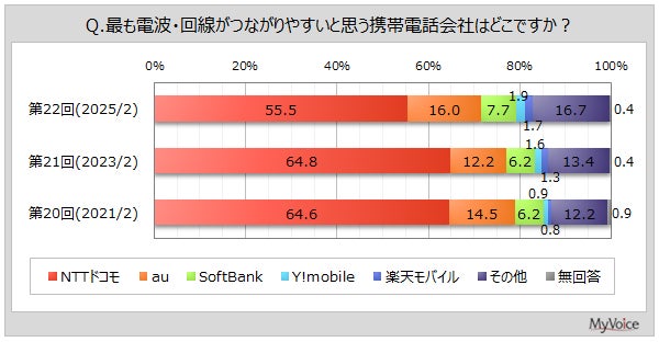 最も電波・回線がつながりやすいと思う携帯電話会社は、「NTTドコモ」が55.5%を占めますが、2023年調査と比べて大きく減少しています。「au」が16.0%、「SoftBank」が7.7%です。