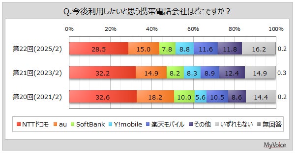 今後最も利用したい携帯電話会社は、「NTTドコモ」が28.5%、「au」が15.0%、「楽天モバイル」が11.6%です。