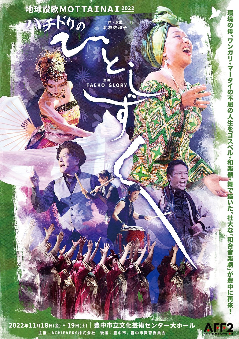 ACHIEVERS株式会社(代表:TAEKO GLORY)主催、『地球讃歌 MOTTAINAI 2022 ~ハチドリのひとしずく~』が2022年11月18日 (金) ~2022年11月19日 (土)に豊中市立文化芸術センター(大阪府豊中市曽根東町3-7-2)にて上演されます。