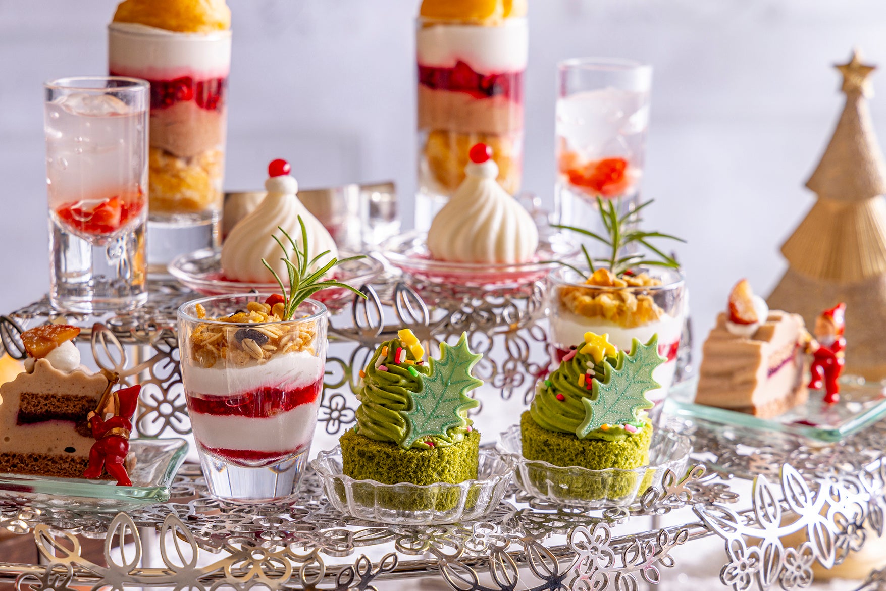 スイーツ:ティラミス、チョコレートケーキ、チーズムース、プロフィットロール、シャンパンゼリー、シュトーレン、ビッシュドノエル、クラナカン、ミニタルトツリー風