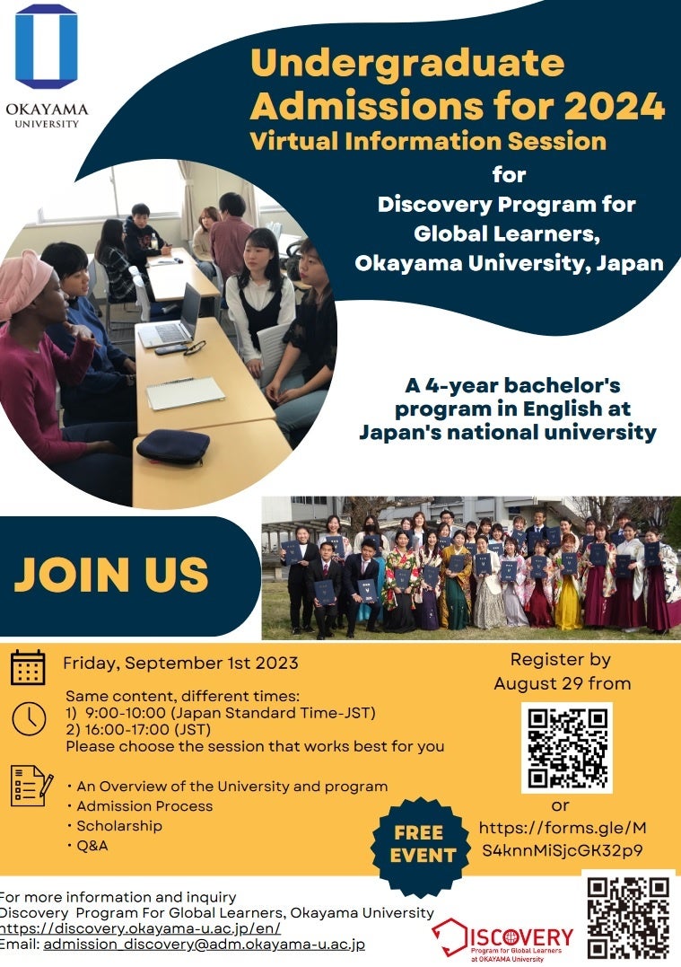 国立大学法人岡山大学(本部:岡山市北区、学長:那須保友)のグローバル・ディスカバリー・プログラムでは、英語による「国際入試説明会」を2023年9月1日(金)にオンラインで2回開催します。
