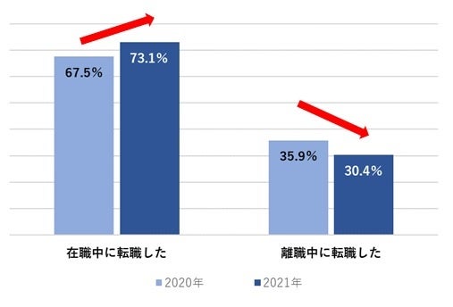 - 2021年の20~50代男女の正社員転職率は過去6年間で最も高く7.0% (7.03%)。前年より在籍中に転職した割合が5pt増加しており、在宅勤務の浸透による影響か。【図1、2、3】
