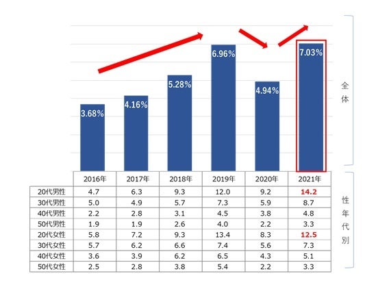 ◆2021年の正社員の転職率※は前年比2.1pt増の7.0%(7.03%)だった。転職率は2016年から2019年にかけて増加傾向にあったものの、2020年は減少に転じた。しかし、2021年は若年層を中心に新型コロナウイルス感染拡大前の水準に戻り、過去6年間で最も高くなった。【図1】