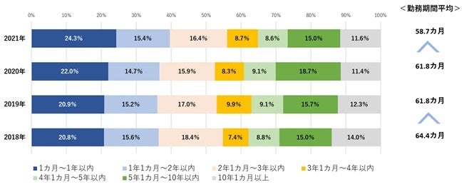 ◆前職の勤務先での就業期間は、全体において平均58.7カ月で、この4年間で最も短くなった。