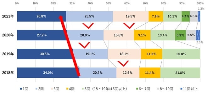 転職回数「1回」が26.8%と最も多いが、その割合は年々減少している。それに対して、「2~3回」の割合が増えてきている。【図6、7】